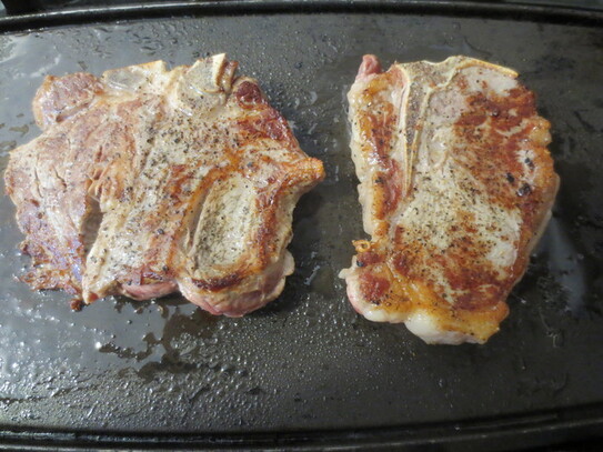 Se încinge o tigaie (de fontă) la foc mare. Când tigaia este încinsă, se adaugă câteva picături de ulei apoi se pun imediat bucăţile de carne. Se lasă cam un minut apoi, carnea se întoarce pe cealaltă parte, şi se mai lasă un minut. Se formează astfel o crustă de culoare maro aurie, care va ţine carnea din interior suculentă.
