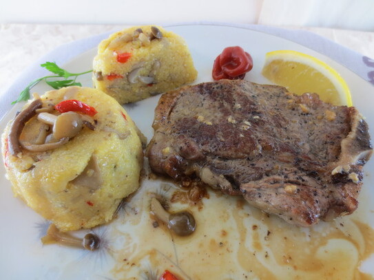 Se poate servi cu salată, cartofi, garnitură de orez sau ciuperci. Amatorii de combinaţii mai îndrăzneţe, pot încerca o garnitură de mămăligă cu ciuperci scăzute. Este un fel de mâncare iubită de diabetici sau de cei care sunt alergici la gluten.