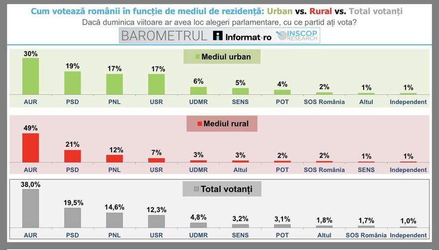 "Barometrul Informat punct ro – INSCOP relevă diferenţe consistente între opţiunile de vot din mediul urban unde competiţia se echilibrează între AUR, PSD, USR şi PNL, respectiv cele din rural în care AUR domină masiv preferinţele electorale, urmat la distanţă mare de PSD. Această structură reflectă nu doar opţiuni partizane, ci moduri diferite de raportare la puterea politică şi la discursul public.