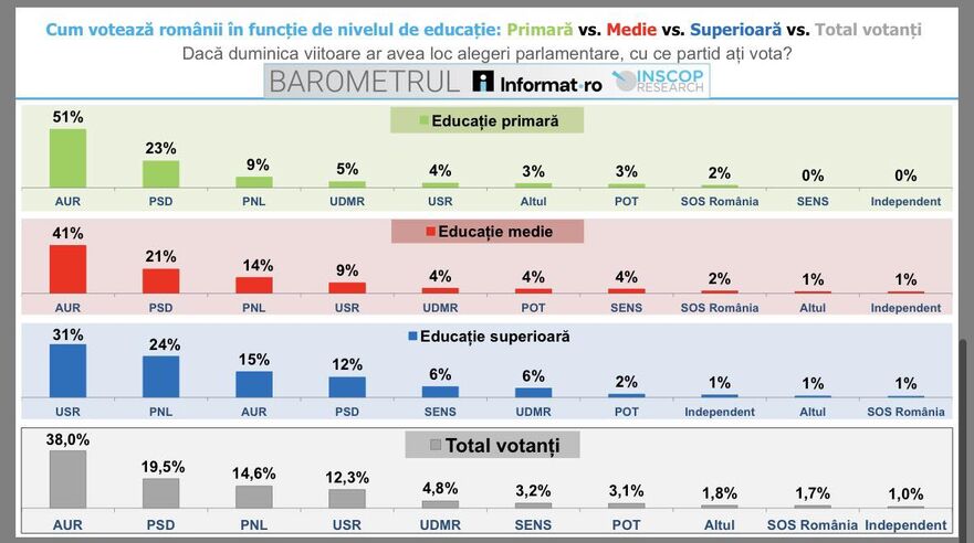 "51% dintre persoanele cu educaţie primară şi 41% dintre cei cu educaţie medie ar vota cu AUR, în timp ce prima poziţie în topul intenţiei de vot al persoanelor cu educaţie superioară ar fi ocupată de USR, cu 31%. Barometrul Informat.ro – INSCOP relevă faptul că educaţia este un predictor important al orientării politice a românilor în general şi al modului de raportare la discursul radical, populist în mod particular. Distribuţia intenţiei de vot arată o polarizare clară între segmentele cu educaţie primară (maxim 8 clase) şi cele cu educaţie superioară în ceea ce priveşte susţinerea partidelor. AUR conduce autoritar în clasamentul intenţiei de vot a persoanelor cu educaţie primară. În contrast, persoanele cu studii superioare favorizează formaţiuni precum USR şi PNL", a arătat Remus Ştefureac.