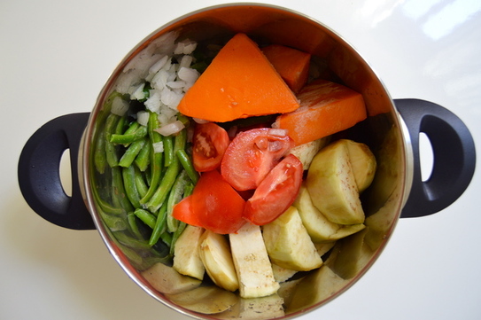 În oala în care se prepară legumele, se pun 2 linguri de ulei, apoi se adaugă ceapa şi usturoiul tăiate mărunt, cât şi morcovii, vânăta, roşiile şi dovleceii tăiaţi în bucăţi mari, păstăile de fasole verde, frunzele de busuioc rupte sau pătrunjelul tăiat mărunt.