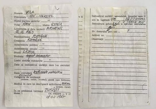 1.bis De la jumătatea anilor ’70 Securitatea începe prelucrarea automată a datelor şi ia naştere o baza de date, care este oglinda aproximativă a acestor fişe de cartotecă. Doar că, atunci când v-o imaginaţi, va trebui să o raportaţi la resursele din ani ’70-’80 şi să nu aveţi aşteptările pe care le avem de la o bază de date din prezent. Odată completată fişa, aproape toate informaţiile din aceasta vor fi introduse şi în baza de date (ţineţi minte acest 'aproape toate', va fi important mai târziu), iar modificările apărute pe parcursul colaborării vor fi consemnate inclusiv în baza de date (modificări ce se pot referi la persoană, la specificul colaborării, la ofiţer, dar şi la eventuala ştergere a înregistrării, consecutiv distrugerii dosarului).