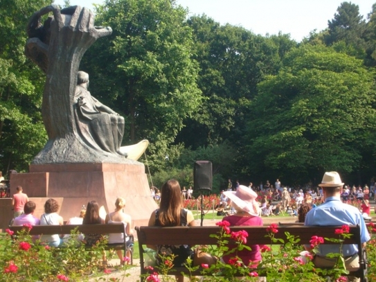 Ziua mea s-a încheiat cu un concert de sâmbătă seara a lui Chopin “Nocturna” în parcul Lazienki. Nici-un cuvânt nu a fost rostit prinţe sutele de oaspeţi în timpul concertului de o oră – un respect imens faţă de artist. Puţin mai jos în parc a fost un concert neaşteptat la palat, unde păuni au cântat împreună cu cântăreţii de operă pe note înalte.