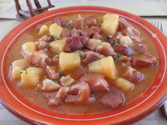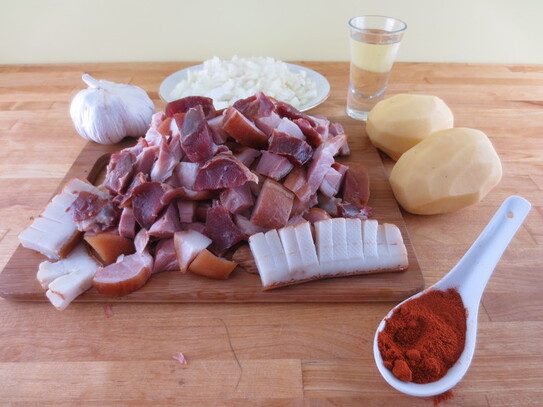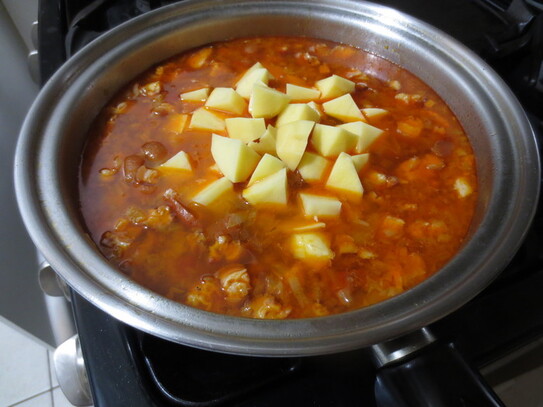 Între timp cartofii se curăţă şi se taie în cubuleţe mici. După ce carnea e făcută, se adaugă cartofii şi se fierbe în continuare cam 20 de minute, până cad cartofii sunt fierţi, dar puţin tari şi nu încep să se sfărâme.