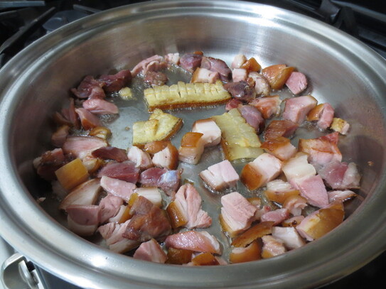Într-o cratiţă largă, se pun mai întâi crestele de slănină să se prăjească la foc mic. Se întorc, de pe o parte pe cealaltă, până când acestea devin crocante, şi lasă grăsime lichidă.