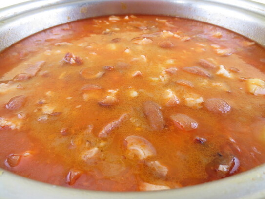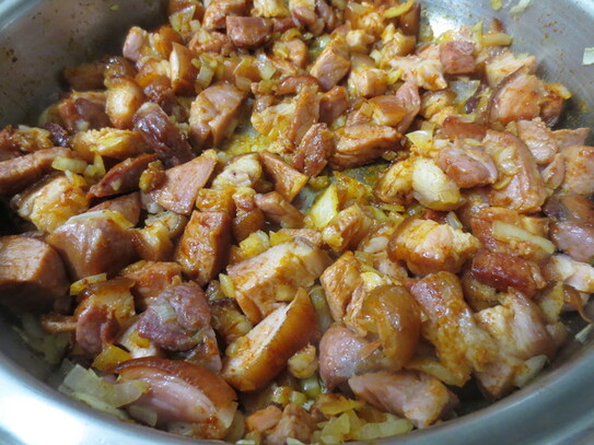 După ce bucăţile de slănină devin de culoare uşor aurie, se pun şi bucăţile de carne cu şoric. Focul se măreşte la mic-mijlociu. Se gătesc câteva minute, apoi se adaugă ceapa, amestecându-se din când în când.