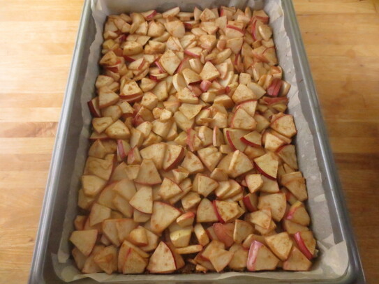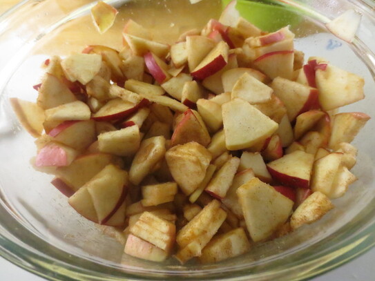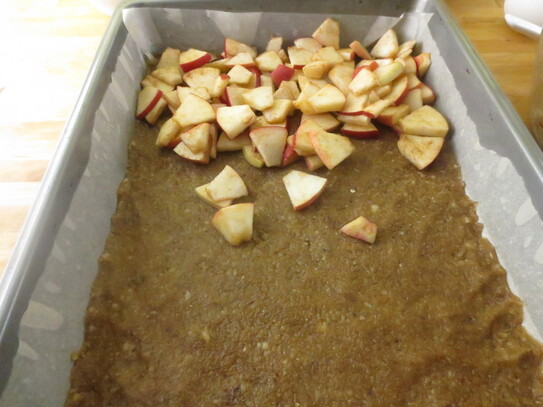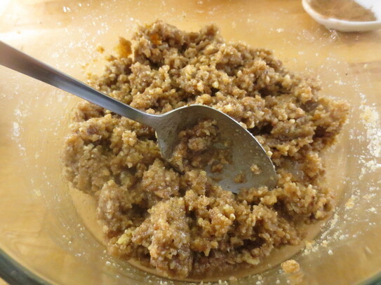 Merele se spală şi se curăţă de coajă dacă doriţi. Merele se taie în opt, se curăţă de cotor, apoi se feliază subţire şi se pun într.-un castron. Feliile de mere se amestecă cu 2 linguri de zahăr şi o linguriţă de praf de scorţişoară, după care se întind într-un strat uniform peste crusta de nuci.