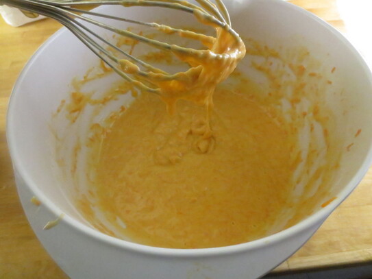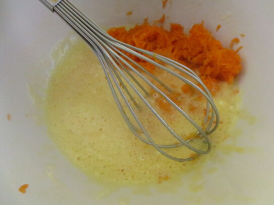 Gălbenuşurile se freacă cu zahărul, apoi se adaugă pe rând câte o lingură de ulei şi una de dovleac ras fin, amestecându-se cu un tel sau spatulă până când toate ingredientele se încorporează.