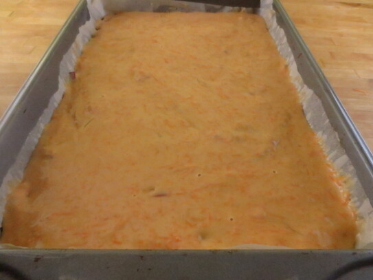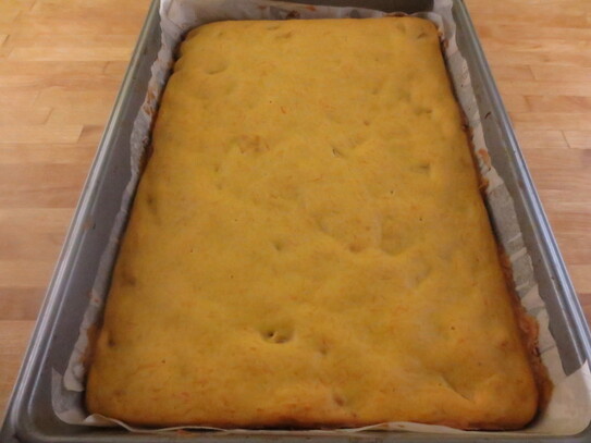 Cuptorul se încinge la 180 C, iar tava de prăjitură (de dimensiunea 22cm x 33cm x 5 cm) se unge cu puţin ulei şi se tapetează cu hârtie de copt.