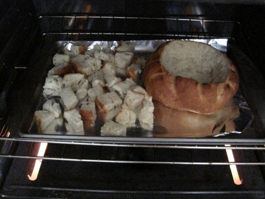 Decupaţi o bucată rotundă din partea de sus a pâinii, şi scoateţi uşor pâinea din interior. Lăsaţi o grosime de 1-2 centimetri de coajă pâine atât lateral cât şi în partea de jos dându-i forma unui "castron". Bucata de pâine decupată se taie în cuburi pentru a face crutoane. Dacă vă plac să fie crocante, puteţi-le în cuptorul încins la 165 grade, pentru un sfert de oră.