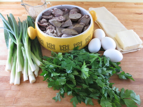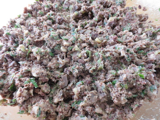 Se curăţă şi se taie mărunt ceapa, usturoiul şi pătrunjelul apoi se amestecă toate împreună cu organele măcinate, pesmetul, untul şi cele 4 ouă. Pentru a atenua mirosul şi gustul specific cărnii de miel, se pune cât mai multă verdeaţă.