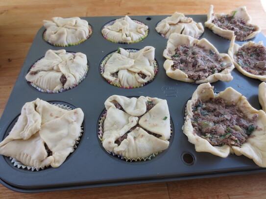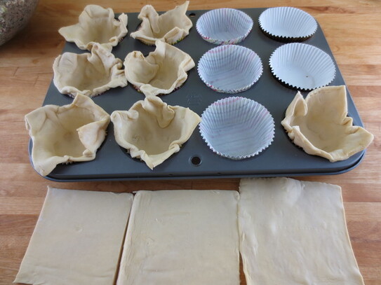Pătrăţelele din aluat se pun în fiecare formă de brioşă.