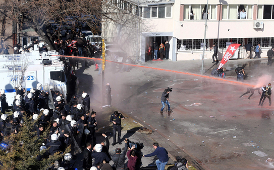 Face înconjurul lumii pe web fotografia unei jurnaliste TV, făcută în Ankara în timpul unei demonstraţii în faţa Parlamentului. Femeia este lovită în plin şi efectiv "măturată" de jetul unui tun de apă tras de poliţie, în timp ce raporta despre protest, relatează vineri, 14 februarie, presa turcă.