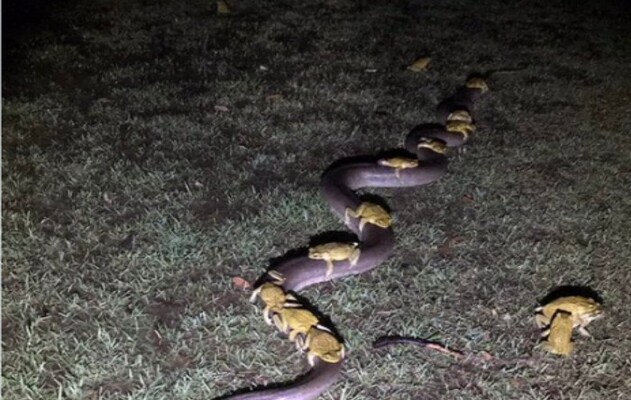 Iar pitonul pare destul de inteligent pentru că nu a încercat să îşi mănânce 'pasagerii' – broaştele maro deţin o toxină mortală ce poate ameninţa speciile mari precum şerpi, şopârle şi crocodili.