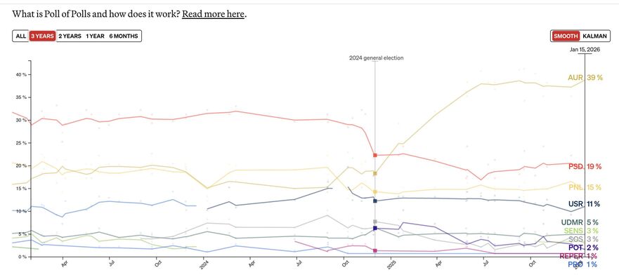 "Se poate vedea că în momentul alegerilor şi AUR şi PSD şi PNL au scăzut, dar în realitate e vorba de nişte voturi care apoi s-au redistribuit. Acum AUR este pe media sondajelor la 39%. Adică la dublul faţă de acum un an. Am pus şi varianta nerafinată, ca să vedeţi că sunt multe şi diferite, dar trendul e acelaşi", a comentat Cătălin Teniţă.