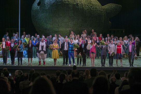 Interpreţii, solişti, cor şi figuranţi, cântă şi râd, arătând cu degetele către oamenii din public, într-un final carnavalesc unde, pe fondul ultimelor acorduri forte ale orchestrei, printre râsete, din zona posterioară a uriaşei machete porcine ţâşneşte ‘apoteotic’ un jet de confetti, înaintea aplauzelor publicului, distrat peste măsură de această inedită producţie de operă, în premieră la ONB.
