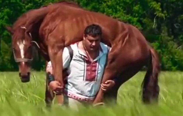 Acest colos ucrainean în vârstă de 38 ani, primul campion al ţării sale la culturism fără dopaj, se poate mândri cu 63 de Recorduri Guinness de forţă. Un clip video în care este prezentat cum merge cu calul pe spinare a devenit viral.