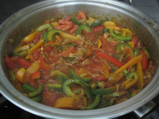 Într-o tigaie, căliţi în ulei prazul, ceapa şi usturoiul până când se înmoaie. Adăugaţi ardeiul tăiat în feliuţe, apoi rosiile tăiate sau din conservă. Le lăsaţi să fiarbă câteva minute, după care le turnaţi într-o oală care se poate pune la cuptor.