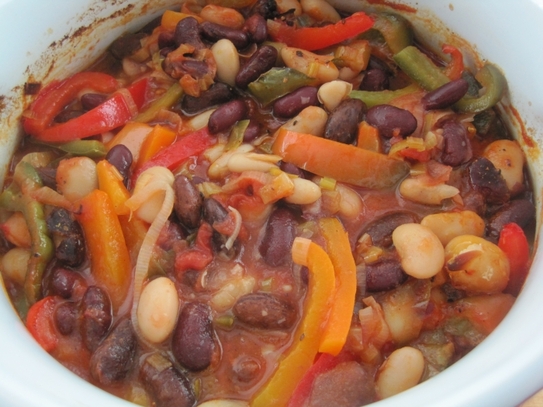 Se adaugă apoi fasolea fiartă,cimbru sau măgheran, se sărează şi piperează după care se amestecă bine şi se dă la cuptor pentru 30 minute. Dacă vă plac măslinele, cu 5 minute înainte de-a scoate oala din cuptor, adăugaţi câteva măsline. La sfârşit adăugaţi frunzele de pătrunjel.