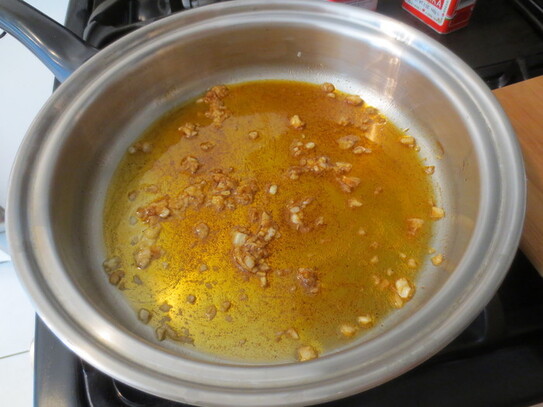Într-o tigaie se încălzeşte bine uleiul, apoi se adaugă usturoiul. Se dă focul la minim şi se amestecă aproximativ un minut. Dacă uleiul e prea încins sau focul prea mare, usturoiul îşi schimbă culoarea în maroniu şi-şi pierde din gust şi aromă. Se adaugă paprica, apoi roşia tăiată mărunt.