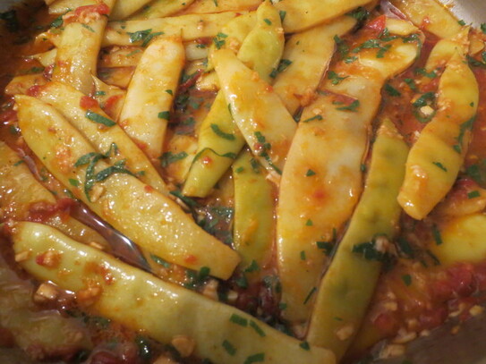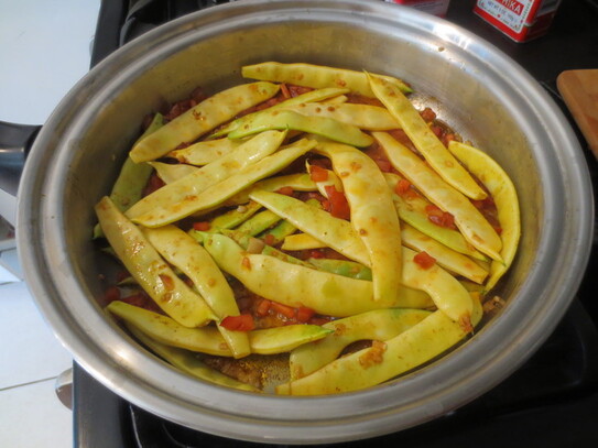 Se adaugă un pahar cu apă, se acoperă vasul cu un capac şi se continuă fierberea păstăilor cam o jumătate de oră sau până sunt fierte. Din când în când se amestecă uşor şi se verifică dacă au suficient lichid.