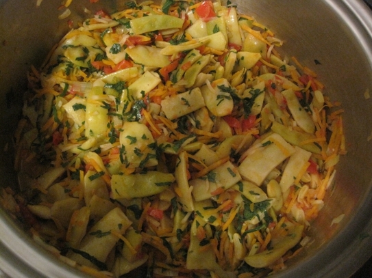 Se curăţă morcovul şi pătrunjelul, după care se dau pe răzătoare. Ceapa şi ardeiul se curăţă şi se taie mărunt. Roşiile se curăţă de pieliţă, apoi se taie în cubuleţe mici.
