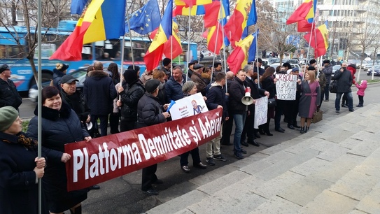 Cele câteva zeci de persoane prezente în faţa BNM ţineau în mână bannere pe care scria: „Cioclea, nu ascunde hoţii. Cine-s mâncăii? Aţi capturat şi furat poporul. La dubă!”, „Leancă, fii şi tu bărbat, spune cine ne-a furat”, „Kroll II publicaţi, cu toţi hoţii demascaţi”.