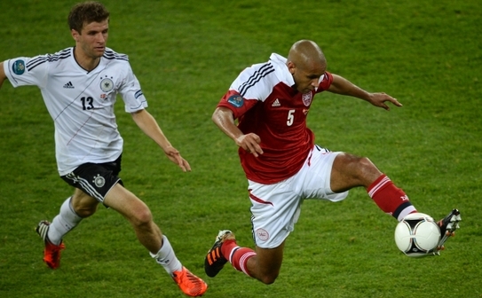Doar cinci minute au condus germanii, pentru că Danemarca a reuşit egalarea în min. 24, prin Michael Krohn-Dehli, cu capul din 7 metri, la mingea trimisă de Bendtner.
