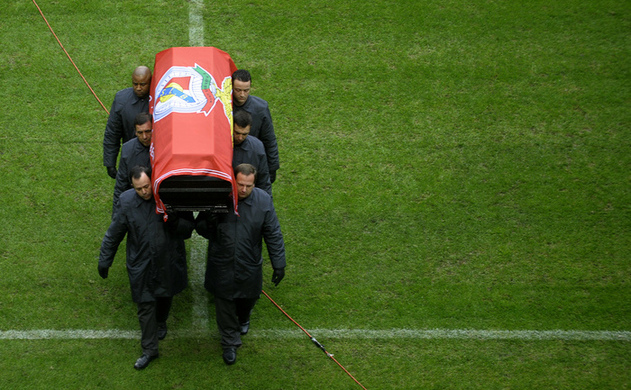 Sicriul, acoperit de un steag roşu al Benficăi, a ajuns la stadion la ora 13,38 GMT, înainte de a fi dus la centrul terenului, unde a fost aşezat pentru puţin timp pe un soclu. Limuzina a făcut încet turul stadionului, pe fundalul melodiei