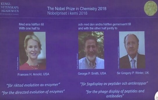 Academia Regală Suedeză a decis să acorde Premiul Nobel în Chimie 2018 pentru două descoperiri. Jumătate cercetătoarei Frances H. Arnold – a doua femeie recompensată în Premiile Nobel 2018 - pentru „evoluţia dirijată a enzimelor” şi cealaltă jumătate cercetătorilor George P. Smith şi Sir Gregory P. Winter pentru „natura bacteriofagă a peptidelor şi anticorpilor”.