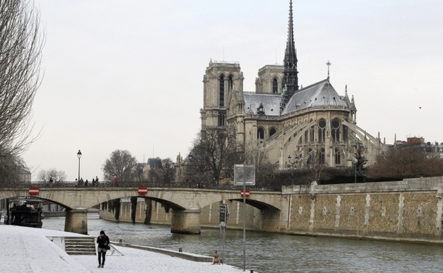 Zăpada şi frigul au pus stăpânire pe oraşul Paris. Într-o poză din 5 febr 2012 se poate vedea malul Senei acoperit de zăpadă în apropierea Catedralei Notre Dame. (FRANCOIS GUILLOT / AFP / Getty Images)