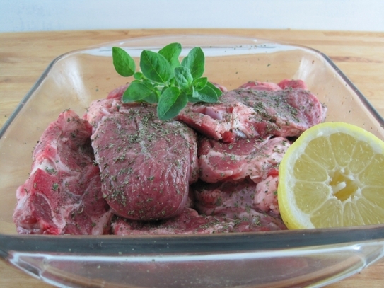 Carnea se sărează, se piperează, după care se presară cu oregano. Se aşează bucăţile de carne într-un vas, apoi se toarnă peste ele sucul de lămâie . Se lasă la macerat cel puţin o jumătate de oră.