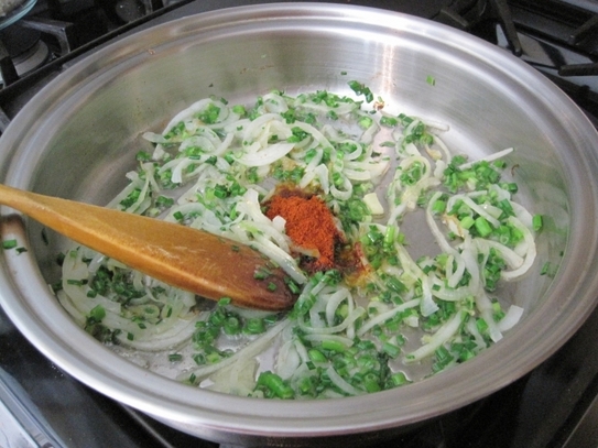 Într-o tigaie, se încinge uleiul, după care se adaugă ceapă şi arpagicul tăiate mărunt. După ce s-au înmuiat bine, se adaugă paprica şi orezul fiert. Se potriveşte de sare şi piper, după care se aşează pe un platou. Deasupra se pun rondelele de dovlecei şi ardei fripte la grătar.