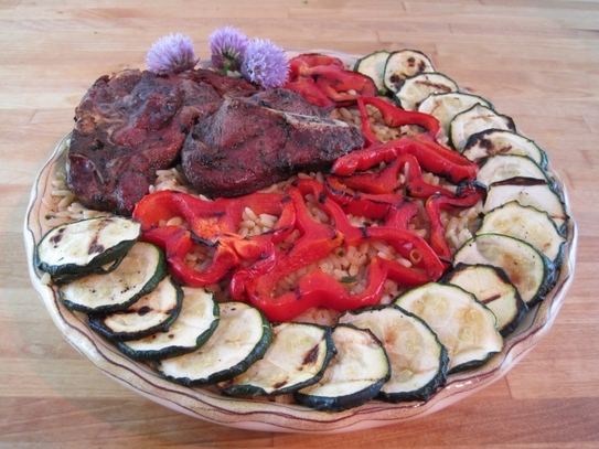 Friptură de miel cu pilaf şi legume la grătar