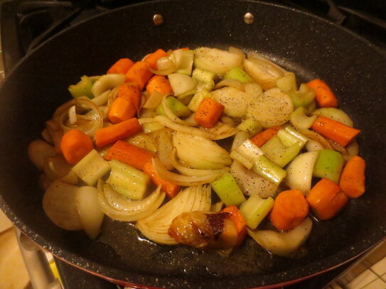 Tigaia în care s-a fript carnea se pune din nou pe foc şi se sotează ceapa, morcovii şi ţelina pentru câteva minute.
