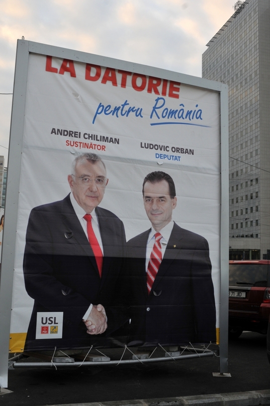 Dintre toate, mi-a atras atenţia recent unul dintre cele foarte mari, care este amplasat în zona Piaţa Victoriei, aproape de clădirea Guvernului din Capitală. De fapt, este o ditamai fotografia în care apare Andrei Chiliman, primarul Sectorului 1 şi fost preşedinte al filialei locale liberale, ca susţinător, alături de deputatul PNL Ludovic Orban, candidat în alegerile parlamentare.