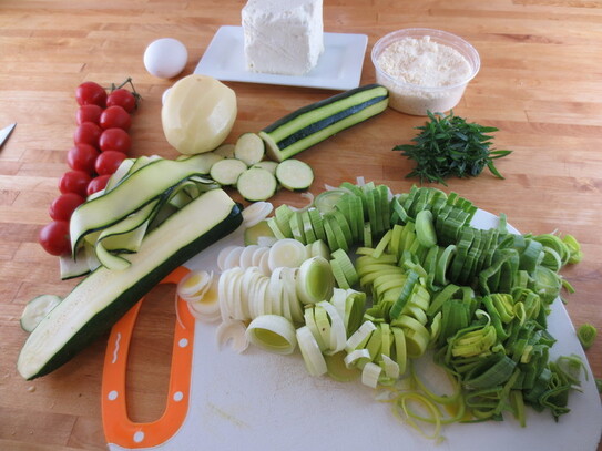 Dovleceii şi roşiile învelite se acoperă cu strat de brânză Aluatul se pliază peste legume, suprapunând uşor părţile crestate. Aluatul se unge cu ou.