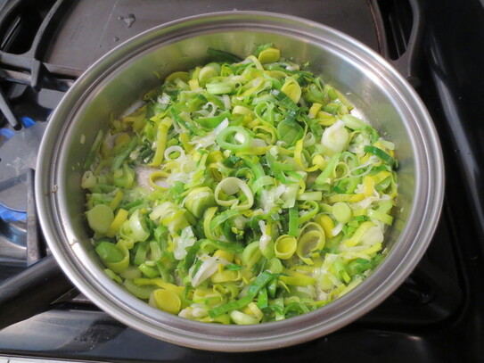 Pentru a se curăţa uşor, prazul se taie în rondele, apoi se spală sub jet de apă, eliminând firele de nisip de pe frunze. Prazul tăiat împreună cu usturoiul mărunţit se pun într-o tigaie cu o lingură de ulei şi se gătesc cam 3-4 minute. Se pune apoi deoparte să se răcească.