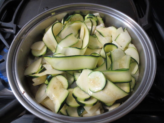 Dovleceii tăiaţi longitudinal şi în rondele se gătesc în puţin ulei timp de un minut. Dovleceii tăiaţi pe lungime se înfăşoară de jur împrejurul roşiilor.