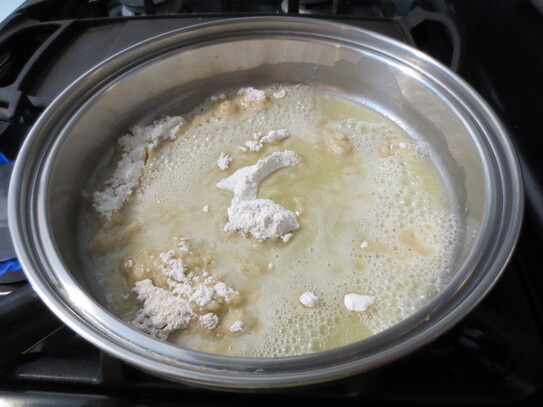 Într-o tigaie încălzită la foc mediu, se face sosul alb folosing 100 g de făină şi 100 g ulei. Uleiul se încălzeşte la temperatura medie, apoi se adaugă făina în ploaie. Se lăsă în continuare pe sobă până când faina îşi schimbă uşor culoarea. Se lasă deoparte să se răcească.