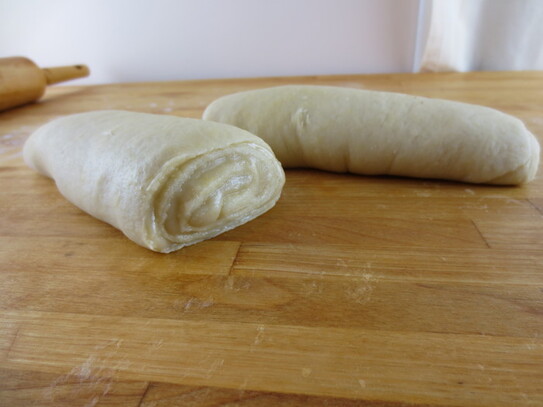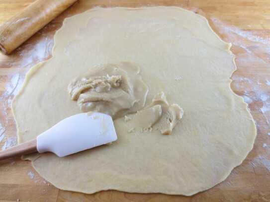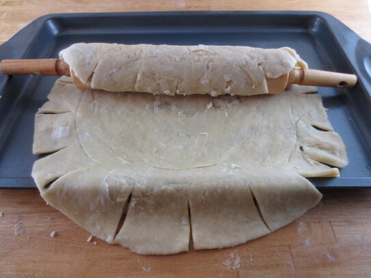 Când aluatul s-a răcit suficient, se întinde într-o foaie subtire, cu ajutorul unui sucitor. Întindeţi aluatul într-o formă de cerc. Foaia se unge pe deasupra cu sosul alb, apoi se rulează. Foaia se întinde din nou în formă de cerc, se crestează cam 4-5 cm adâncime de jur împrejurul circumferintei foii, apoi se transferă în tavă.