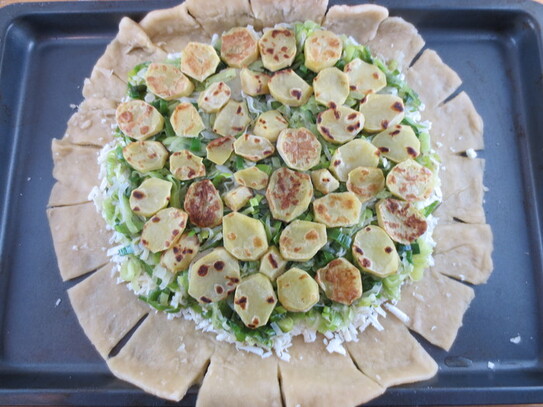 Pe partea de mijloc a crustei, se împrăştie uniform o cană de telemea rasă, apoi se pune stratul de praz, urmat de cel de cartofi.