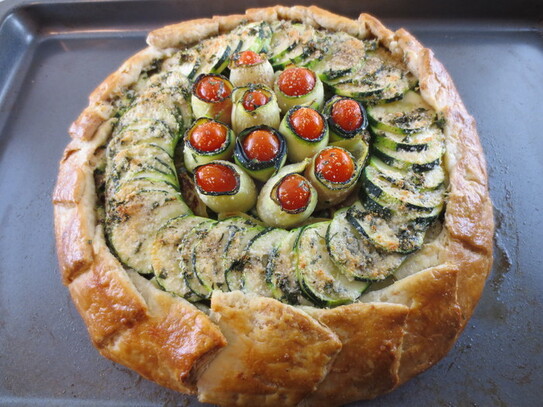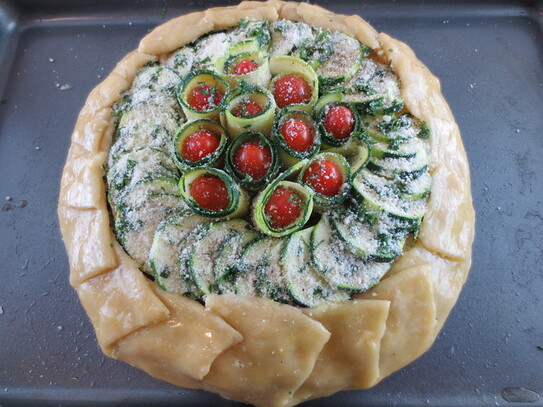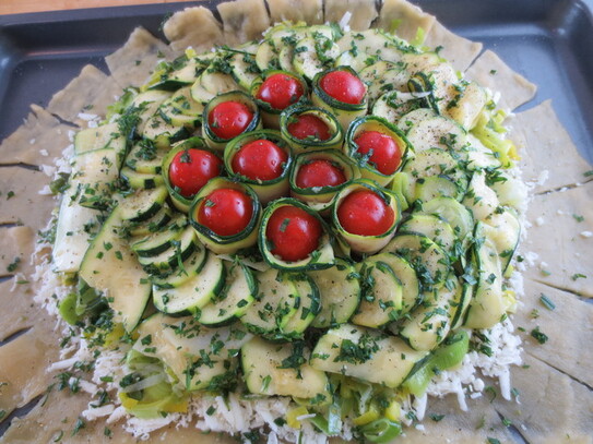 Se pune un rând de rondele de dovlecei, lăsând 2 cm liberi, pentru a lăsa aluatul să se plieze, iar în centru se pun roşiile învelite în feliile de dovlecei tăiate pe lungime.