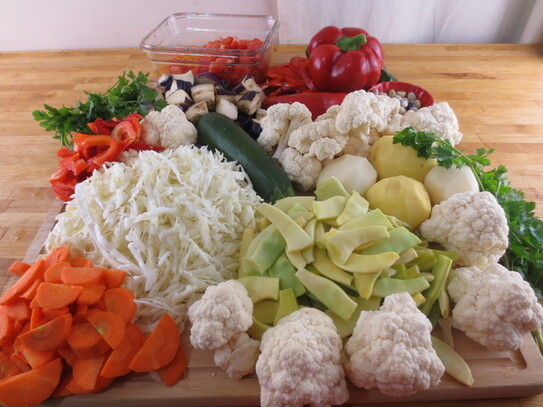 Între timp se pregătesc celelalte legume. Ceapa se taie mărunt, gogoşarii şi ardeii se taie în felii subţiri, morcovul se taie în felii rotunde sau se dă prin răzătoarea cu găuri mari. Varza se taie fideluţă, iar păstăile de fasole se curăţă de capete şi se rup în bucăţi de 2-3 cm.