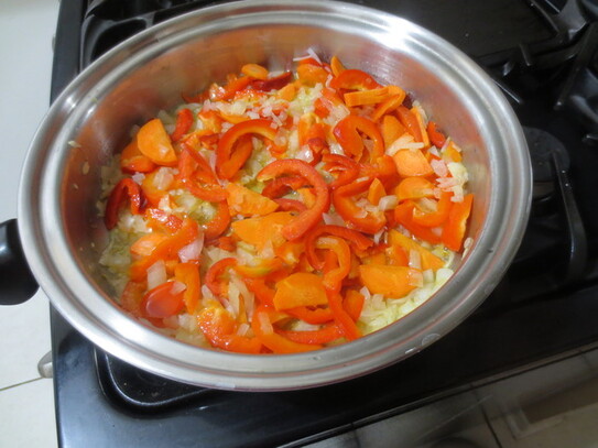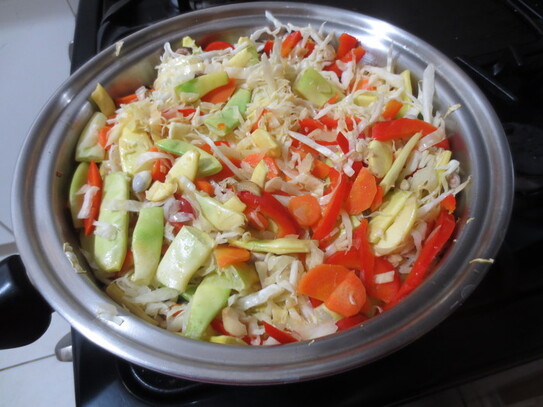 Într-o tigaie sau cratiţă largă, se pun la încălzit 3 linguri de ulei, apoi se adaugă ceapa, gogoşarii şi ardeiul. După ce se călesc câteva minute, se adaugă morcovul. Când morcovul începe să-şi schimbe culoarea se adaugă varza şi fasolea. Se fierbe în continuare la foc mic/mediu pentru 15 minute.