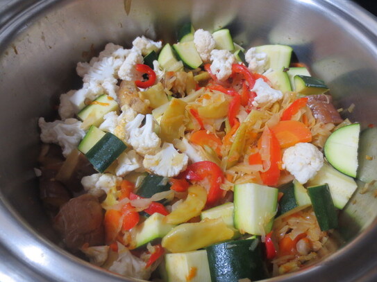 Se continuă fierberea încă 15 minute, după care se adaugă dovleceii tăiaţi în cuburi şi floretele de conopidă si se continuă fierberea. Legumele nu se lasă să fiarbă până când se zdrobesc. Fiecare legumă trebuie să-şi menţină forma şi să-şi păstreze culoarea.