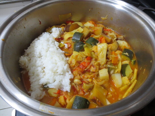 La sfârşit se adaugă orezul fiert în apă cu sare, bine scurs, învârtindu-se uşor până când boabele se amestecă bine cu ghiveciul de legume.