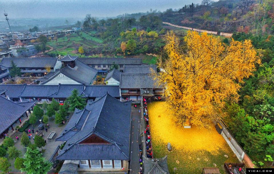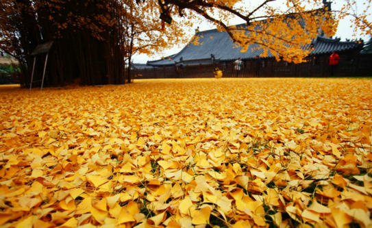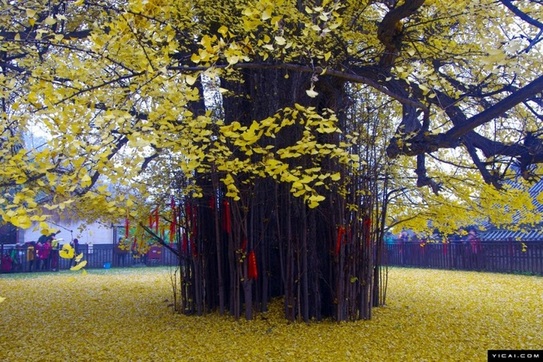 Toamna a adus, ca de obicei, lângă templul budist Gu Guanyin, în regiunea Munţilor Zhongnan - mai precis, în oraşul Luohandong, din districtul Xi'an (provincia Shaanxi), în China - un spectacol minunat. În fiecare an, odată cu sosirea frigului, un copac antic de Ginkgo biloba îşi schimbă "îmbrăcămintea" şi îşi colorează frunzele într-o nuanţă galbenă ca şofranul.