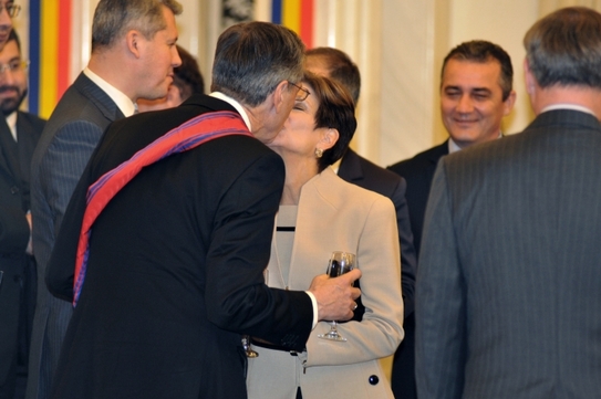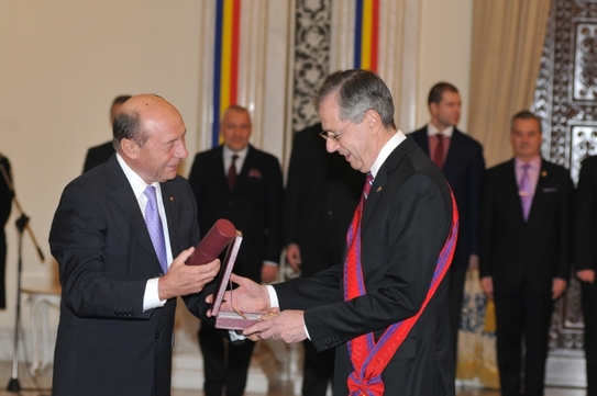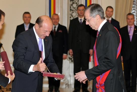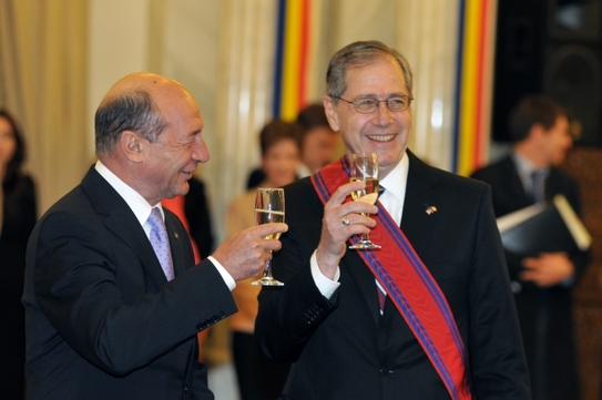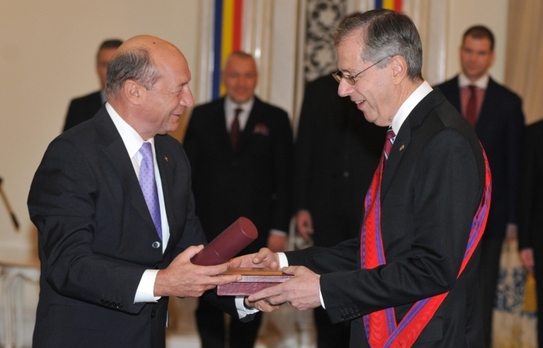 ”Sunt profund emoţionat să primesc această decoraţie. Cei trei ani petrecuţi de mine şi de soţia mea, Libby, în România au fost printre cei mai plini de satisfacţii din viaţa noastră. Am fost onorat de faptul că preşedintele Obama m-a ales să îl reprezint în România, ţara strămoşilor familiei mele”, a spus Mark Gitenstein, care a primit Ordinul Naţional ”Steaua României” în grad de Mare Cruce.