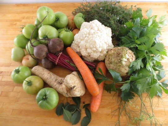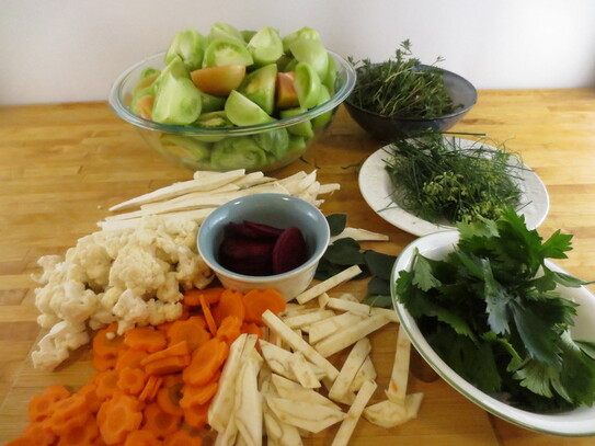Conopida se desparte în bucheţele mai mici, iar ţelina şi hreanul se curăţă, apoi se taie în felii.